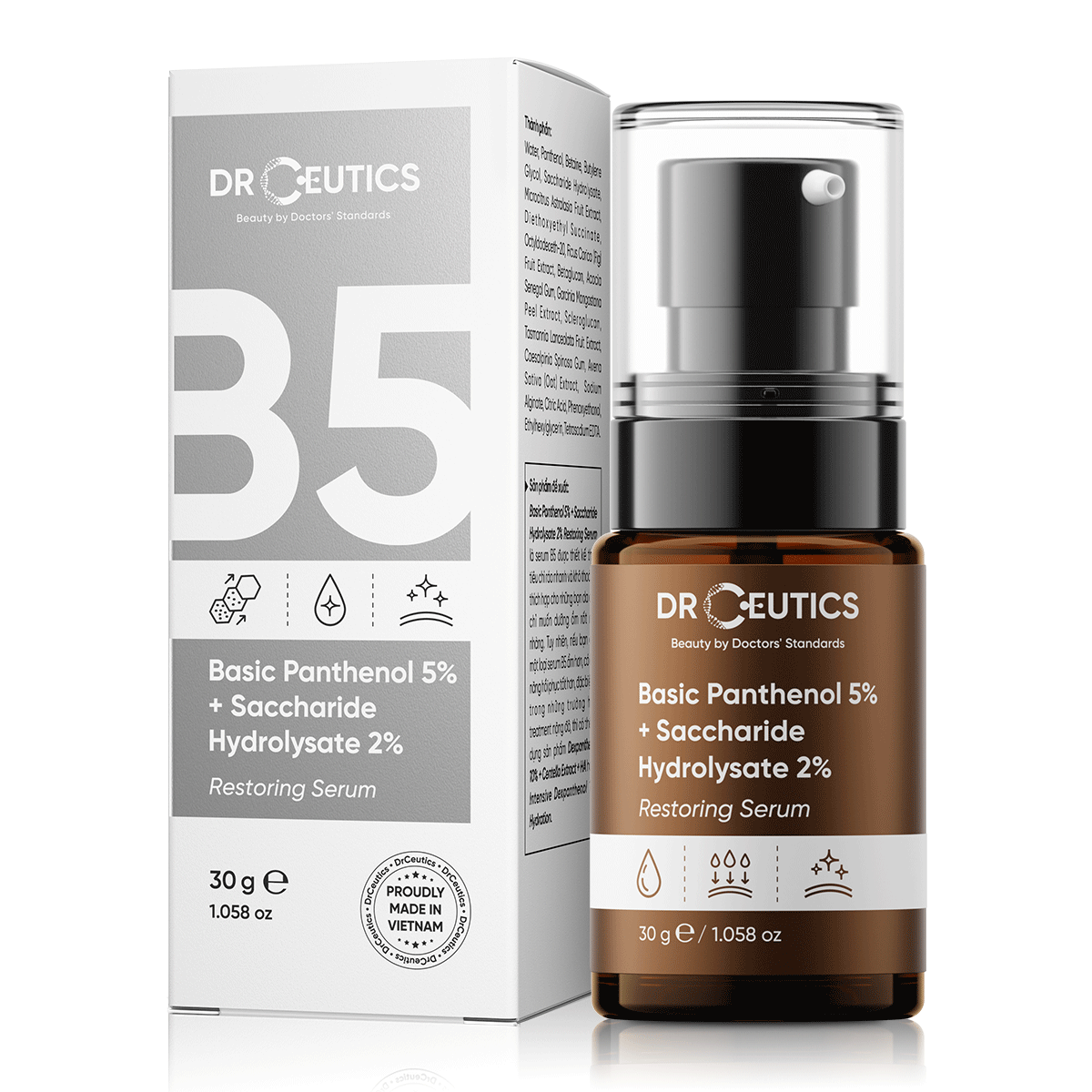 Bao bì: chai thủy tinh, đầu pump, hộp giấy. |