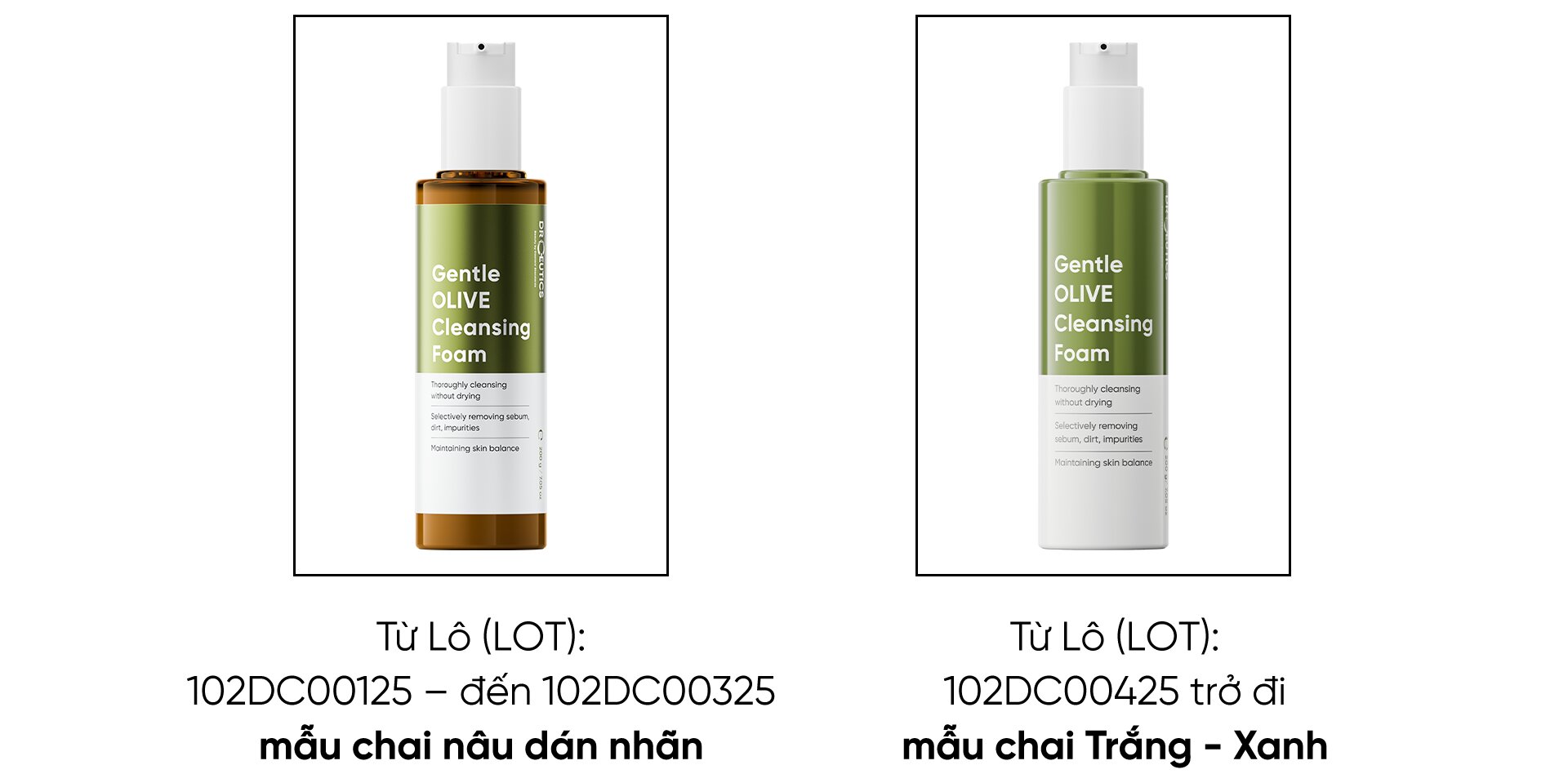 Qua đây, công ty chúng tôi xin thông báo về việc 02 mẫu bao bì sử dụng song song Gentle OLIVE Cleansing Foam 200g số CBMP: 61/25/CBMP-Hgi